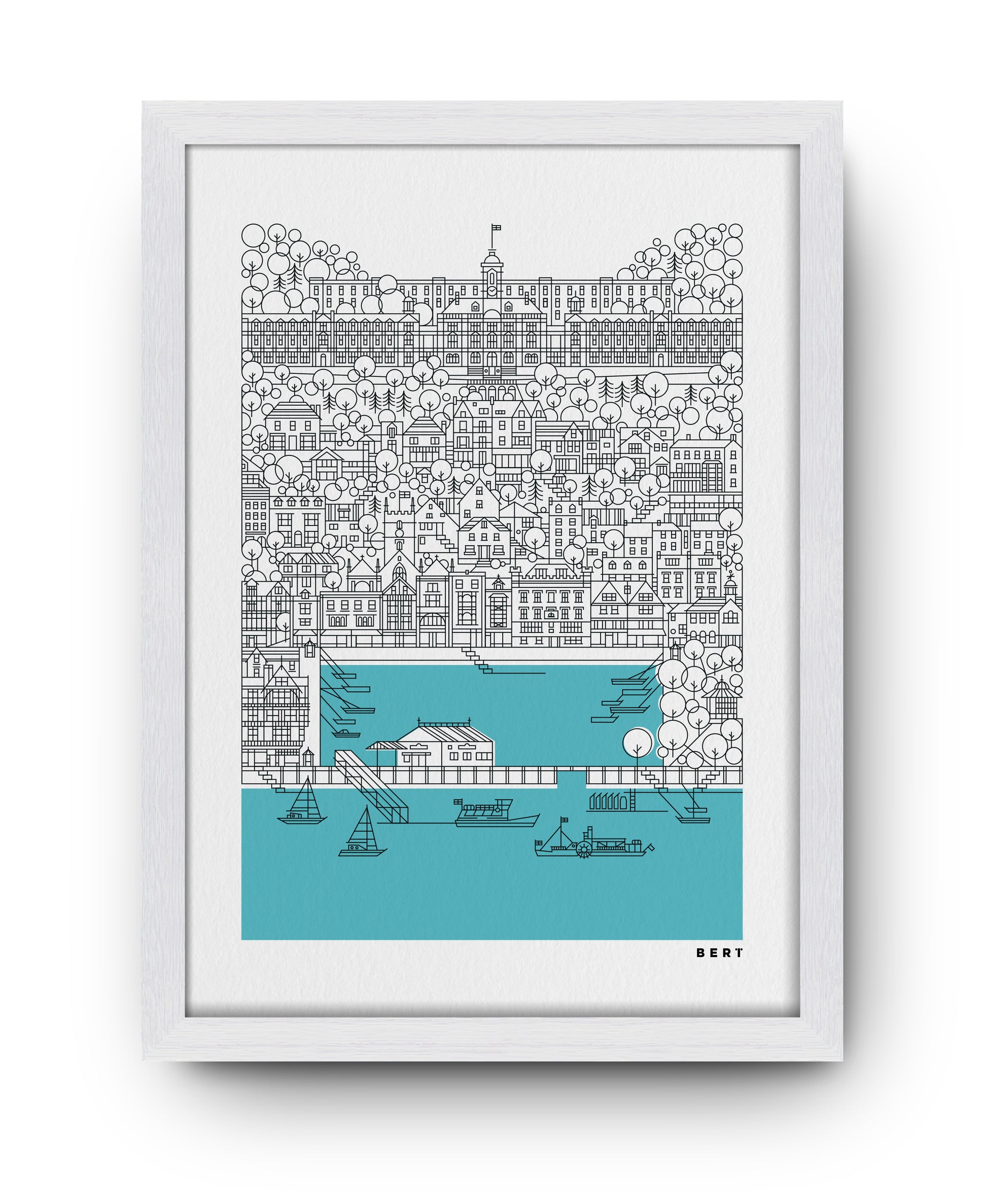 Take in the breathtaking views from the River Dart to the iconic Britannia Royal Naval College with the latest in a series of Dartmouth illustrations by graphic artist, Bert Fowler. The Dart is a limited edition screen print, numbered and signed by the artist.