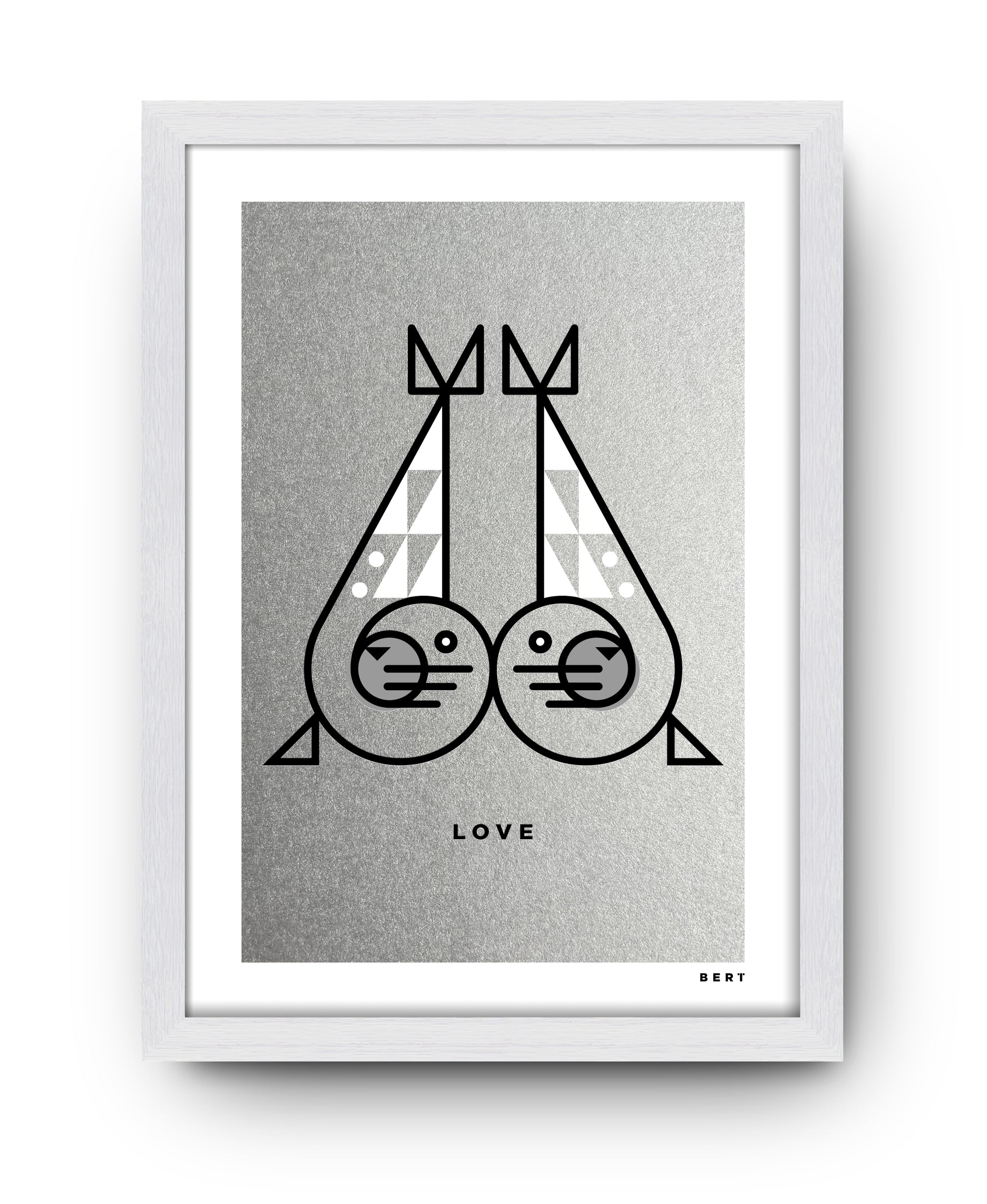 Limited Edition featuring a majestic pair of Seals. Line art, referencing the geometric and cubism, by graphic artist, Bert Fowler. Hand screen printed with layers of metallic silver, black and matt grey. Sammy Seals Silver Love is a limited edition screen print, numbered and signed by the artist.