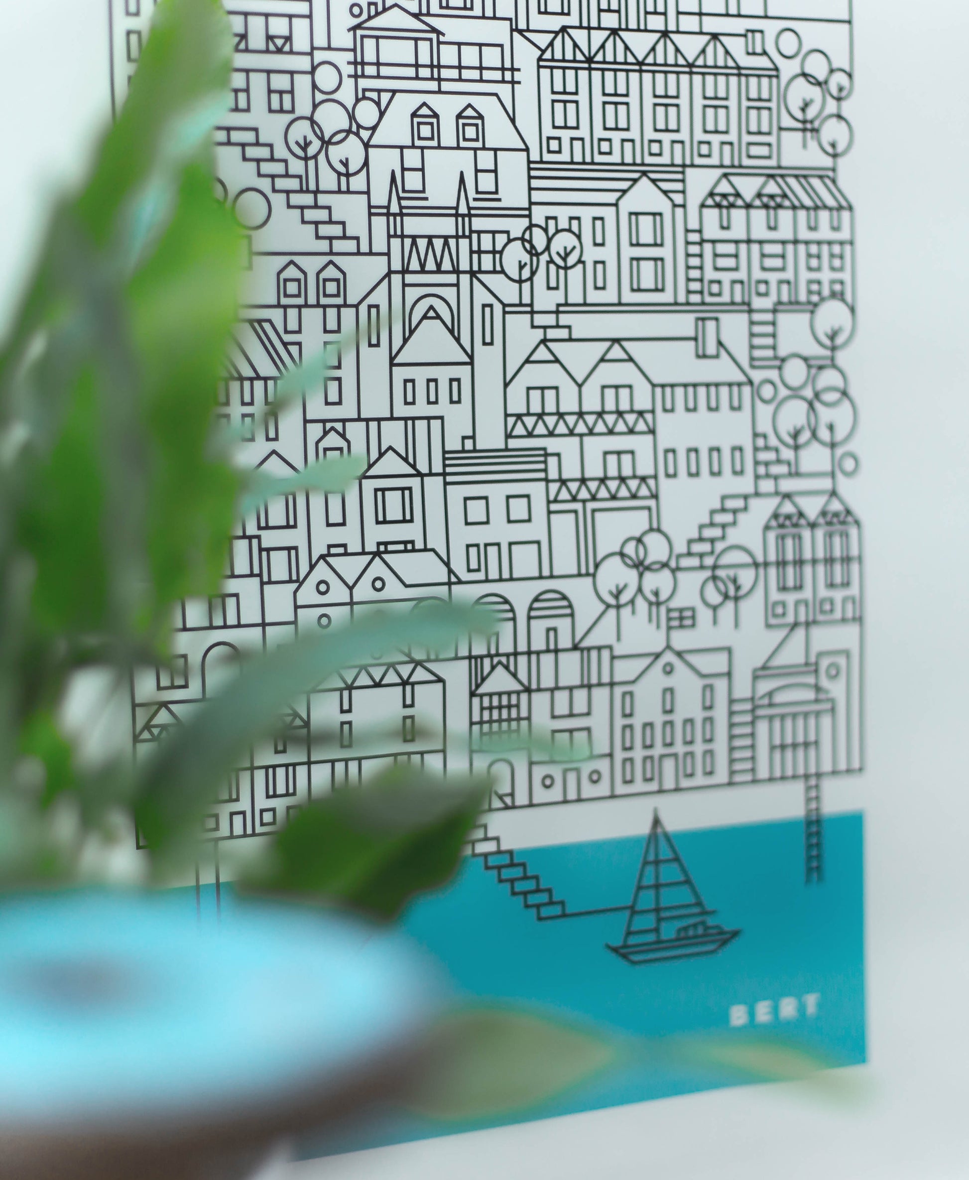 Dartmouth like the place, is an enchanting, contemporary print by Devon artist Bert Fowler. Look once and spot the sailing boat, look twice and see the church, look again and admire the quirky houses that sit on the banks of the River Dart. Take home this modern classic today.
