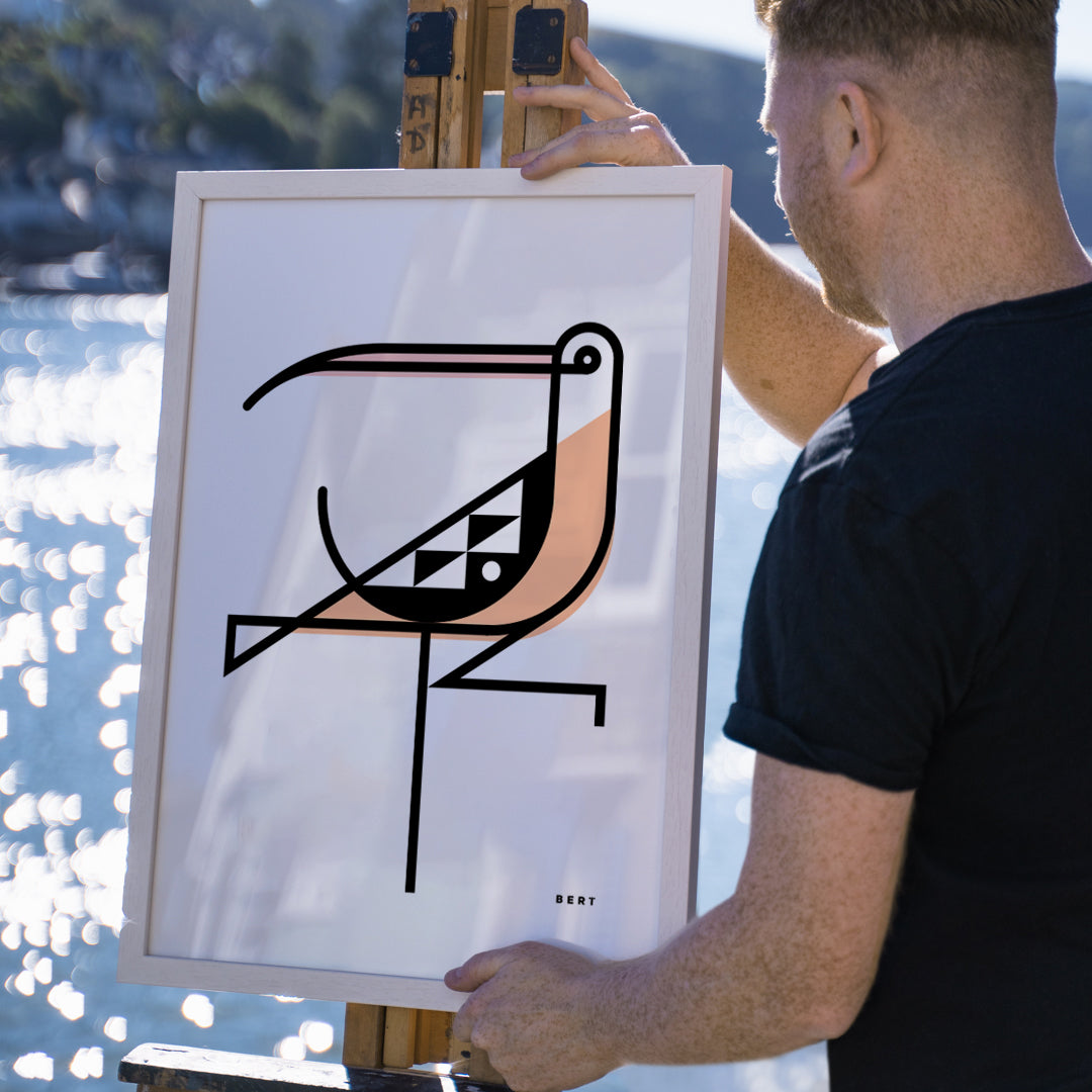 Crafted with Bert's signature line art style, Calling Curlew is a testament to pure, stripped-back elegance. Infused with the soothing tones of Pantone's Colour of the Year, Peach Fuzz, each stroke breathes life into these wildlife wonders, evoking a sense of beauty and tranquility.