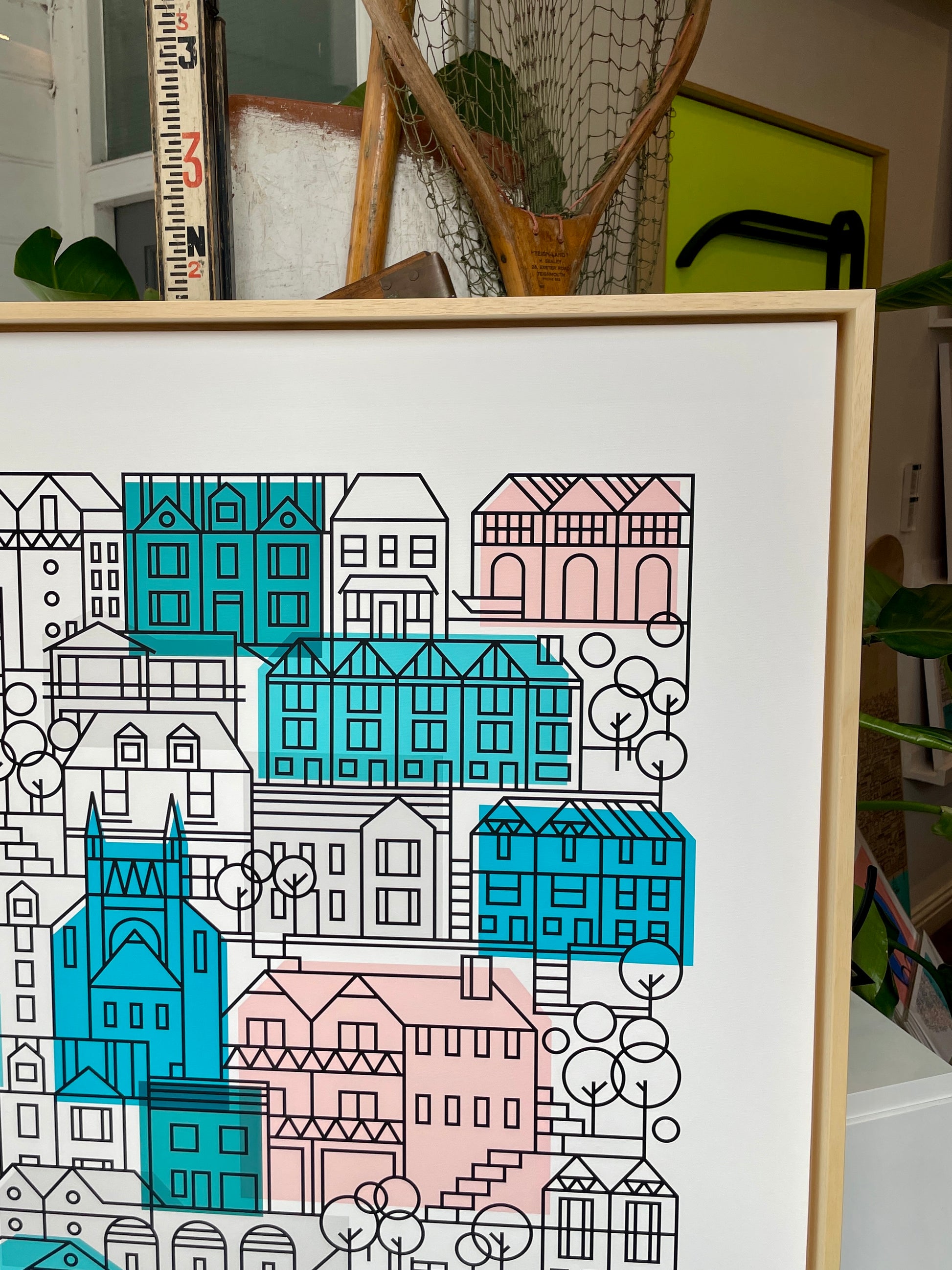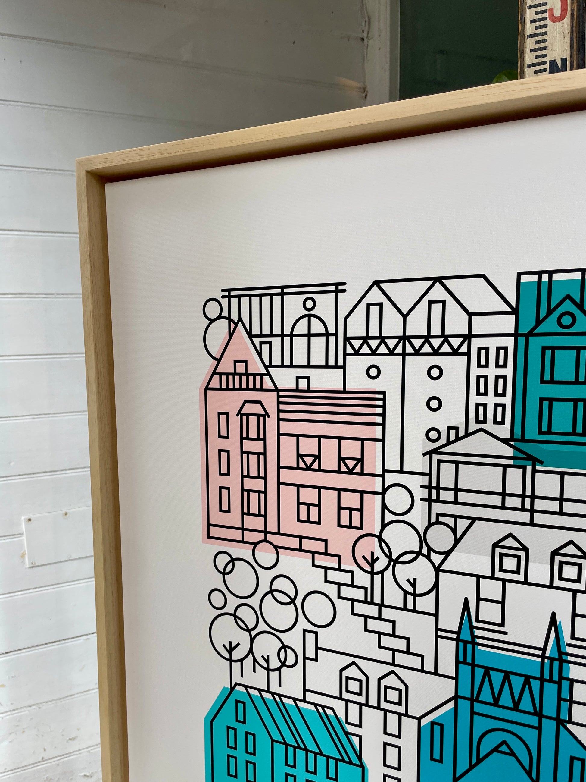 This large canvas features dreamy Dartmouth and its colourful houses - a coastal scene like no other. The intricate line work features some of my most favoured buildings and there’s even a sailing boat, set on a hue of blue that I just adore. For those who are as enchanted by this place as me, this is a true statement of our love. This is a Limited Edition of 10, set in a beautifully modern floating frame in natural wood. Each piece is a unique creation, signed and numbered, ensuring its exclusivity. A conversation between form and function, a fusion of tradition and modernity, inviting you to experience the beauty of simplicity by artist Bert Fowler.