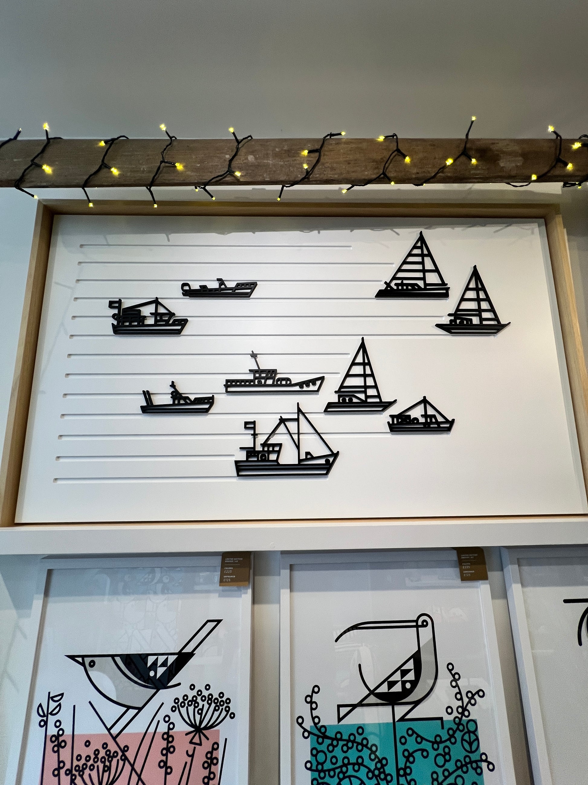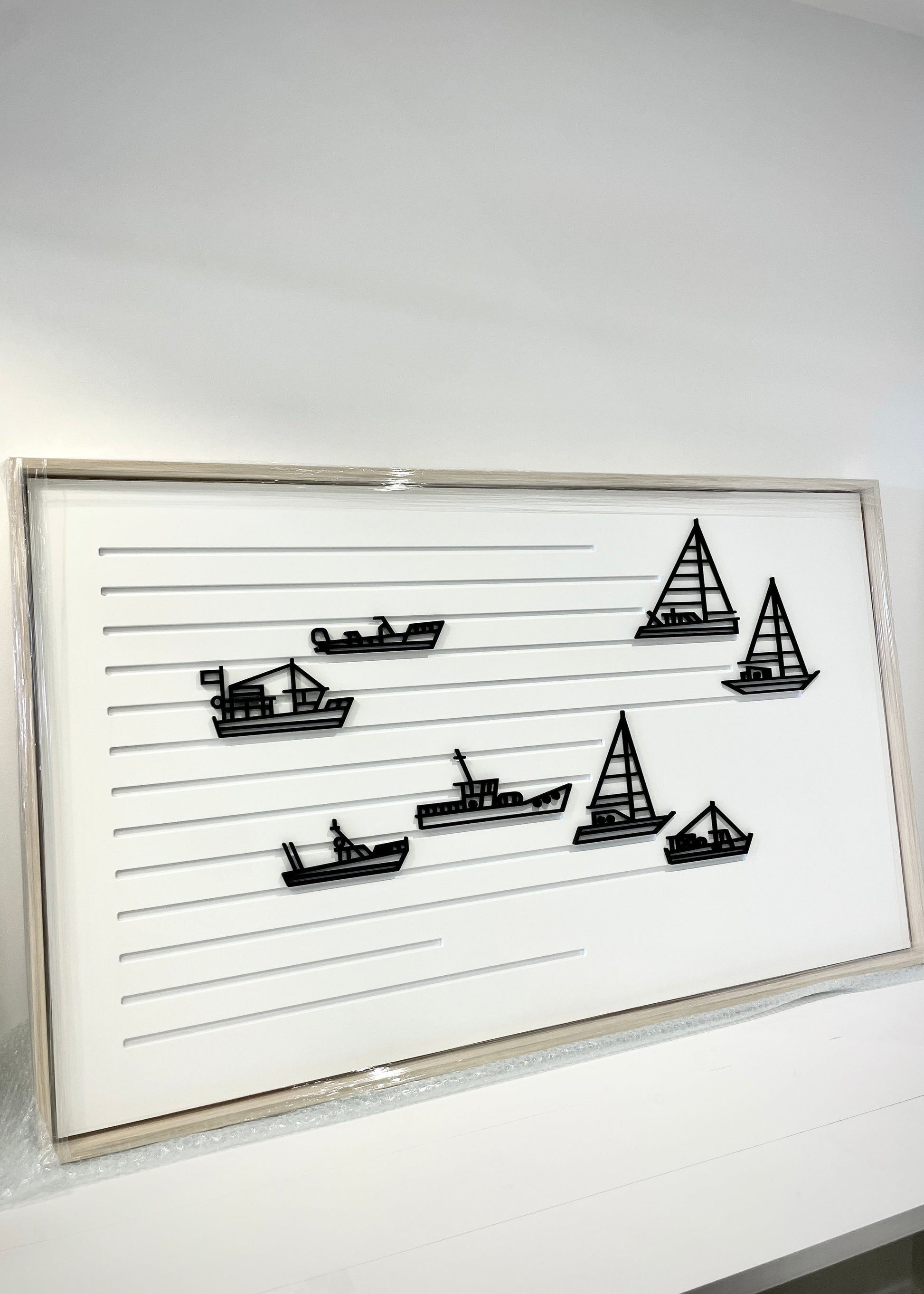 Original Design: Featuring three dimensional recessed lines for the waves (a modern take on the nautical stripe) and intricately cut out boats placed upon them in a captivating style.