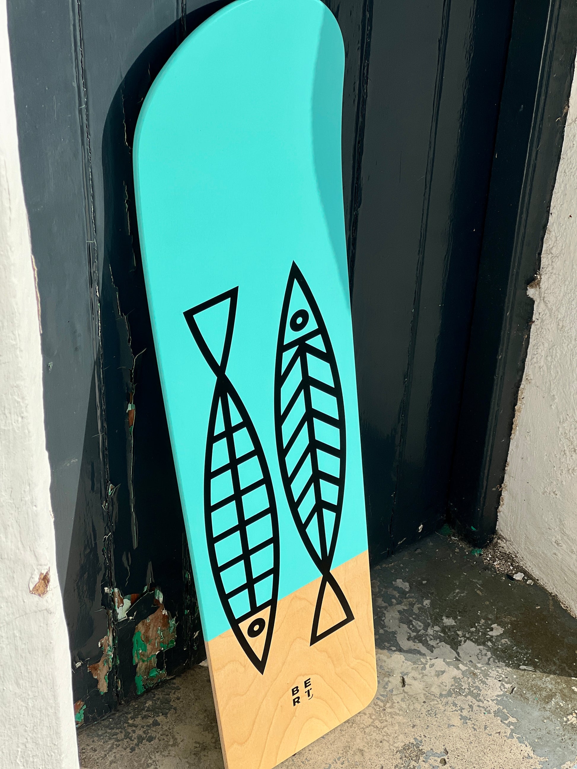 Introducing my inaugural limited edition bellyboard art, an embodiment of my profound adoration for the ocean. This creation embodies my distinctive signature line art style, with black geometric fish meticulously placed upon a canvas of serene seafoam blue on wood.